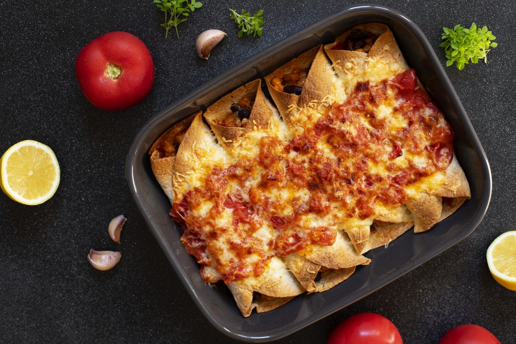 An Enchilada refers to a corn tortilla that gets wrapped around a filling and covered with sauce. Depending on the recipe, a diversity of ingredients can get used in Enchilada’s composition. Some common ingredients for filling include potatoes, cheese, and meats. To enhance flavors, the Enchilada also gets garnished using sliced Avocados, Salsa, Cilantro, and other ingredients.
