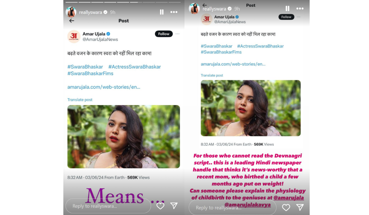 Actor Swara Bhasker recently addressed an article from a prominent Hindi newspaper that body-shamed her and suggested her weight gain was the reason she wasn’t getting film roles. Sharing a screenshot of the article’s tweet on her Instagram Stories, Swara criticised the publication.