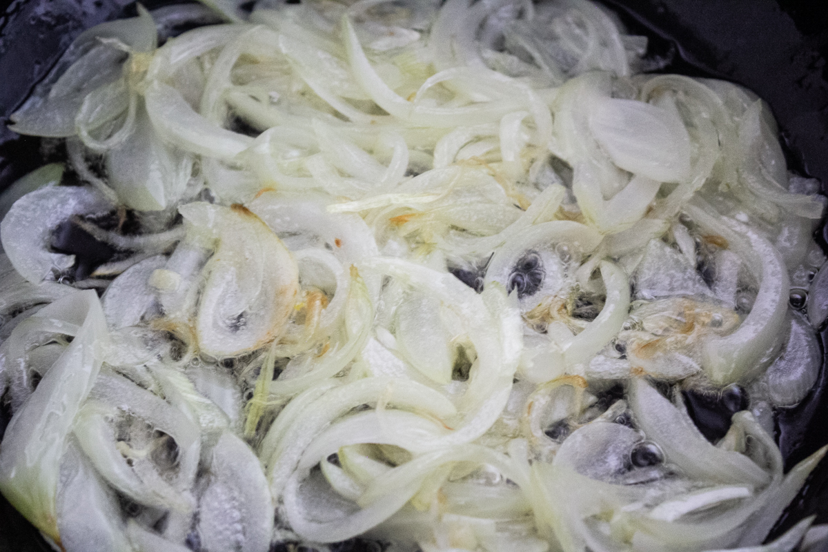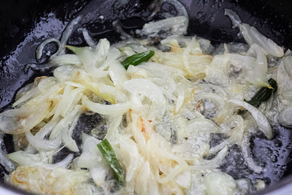 In a heavy-bottomed pot, heat oil over medium-low heat until it begins to shimmer. Add the sliced onion and fry until translucent, about 5 to 7 minutes.