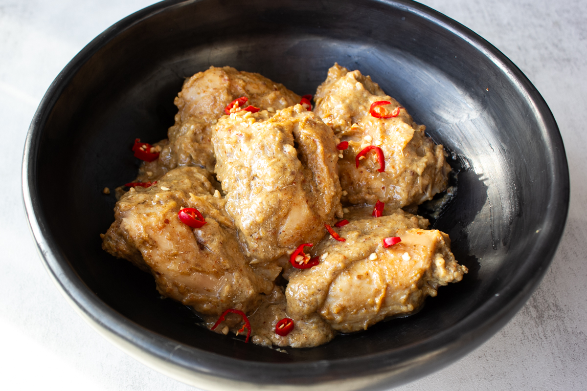 What makes this dish great for weeknights as well as dinner party is that a lot of the prep work can be done in advance. You can dry roast the spices, grind, and store them in an airtight container several days ahead. The chicken can be marinaded at least 6 to 8 hours in advance. When you are ready to serve dinner, just take the chicken out from the fridge roughly 1 to 2 hours in advance, and ideally let it come to room temperature before slow-cooking it in a heavy bottomed pot.