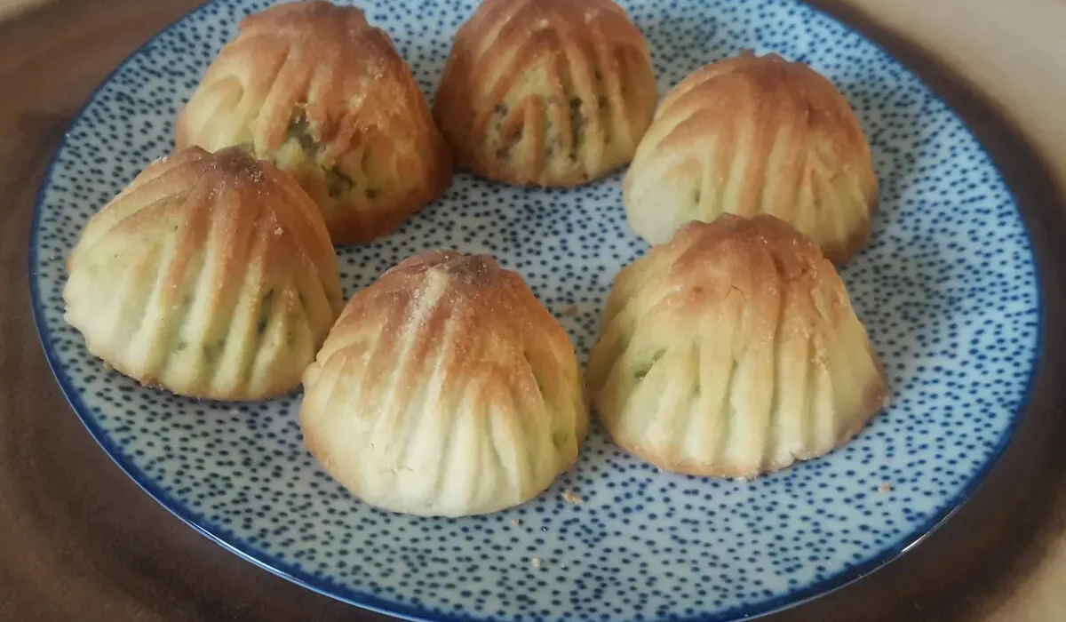 Flatten the small dough ball and make a deep indentation in the centre by pressing down with your thumb. Scoop in a tablespoon of date/pistachio/walnut paste. Pinch the dough from all sides until the biscuit is sealed.